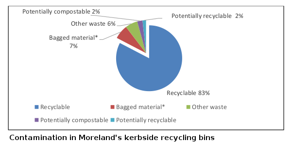 One of the issues we have is a very high contamination rate of recycling bins. The average across Moreland is 17 percent, much greater than the Melbourne average of 6 percent. This can cause problems with the sorting, sale and processing of recycling.