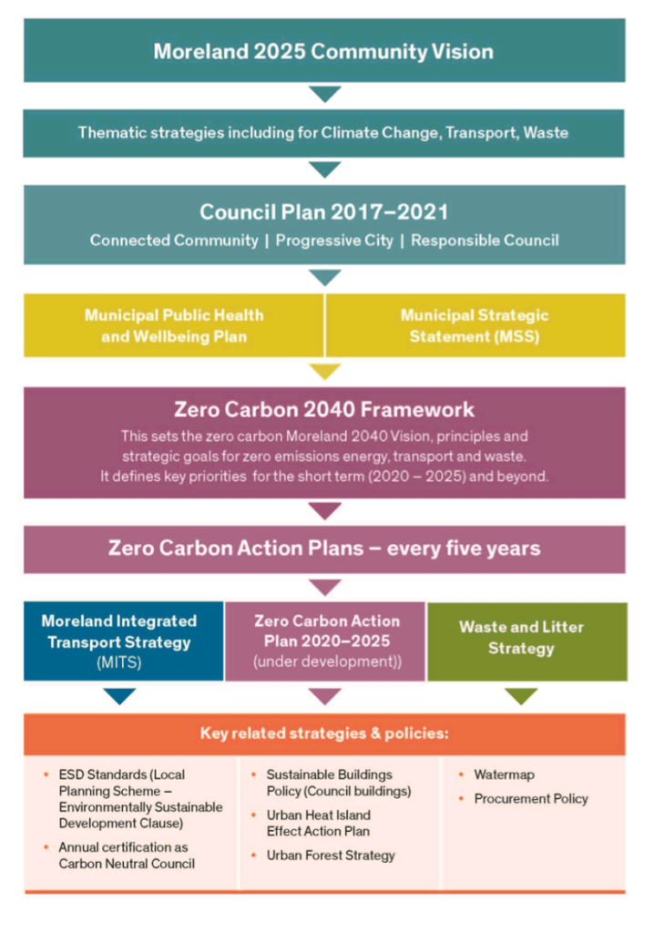 Moreland Council have a range of policies and strategies already addressing climate action through mitigation and adaptation. This graphic provides some relationship detail between the various policies and strategies. Moreland Council staff are doing further work on policy and strategy governance.