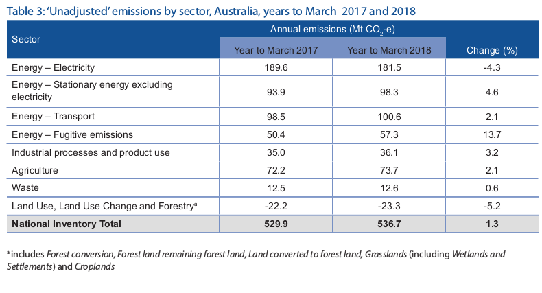 Australia’s targets and commitments to the global community are measured on total emissions reduction, which increased by 1.3 per cent in the year to March 2018.