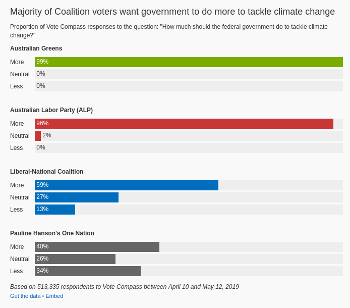 Even when that support was broken down by parties, 59 percent of Liberal National Party voters also supported greater climate action.