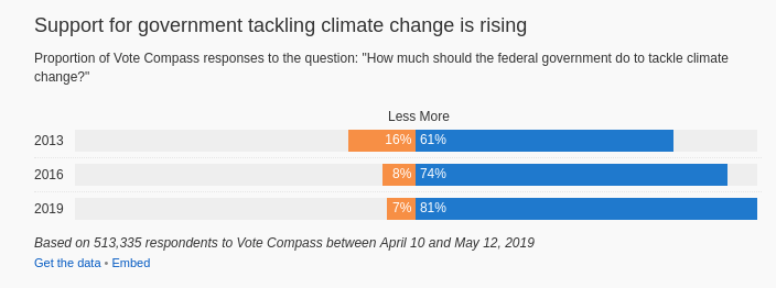 The Votecompass survey, encompassing well over half a million citizens found that support had grown to 81 per cent for greater climate action.
