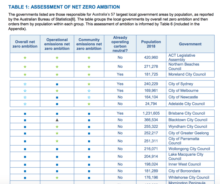 “Three (five per cent) of the 57 governments considered have fully aligned net-zero-by- 2050 targets that address both operational and community emissions (Moreland City Council, Northern Beaches Council and the and the ACT Legislative Assembly, which has both state and local government accountability).”