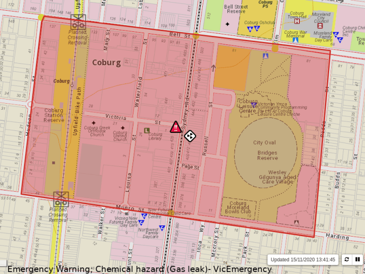 The hazardous gas leak at 424 Sydney Rd, Coburg, has prompted an emergency warning at 12.20pm on Sunday 15 November. Gas fumes spread towards Victoria St Mall. All Gas services in the area have been impacted.