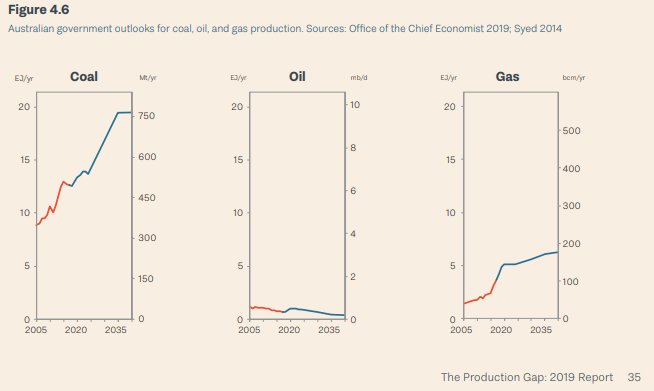 “Australia: Government projections show coal production growing another 10% by 2024 and 34% by 2030, relative to 2018 levels (Office of the Chief Economist 2019; Syed 2014). As shown in Figure 4.6, the government also envisions gas production growing 20% by 2024 and 33% by 2030 relative to 2018 levels (Office of the Chief Economist 2019; Syed 2014).