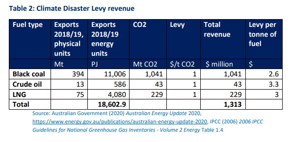 - The Australia Institute is proposing a National Climate Disaster Levy initially set at $1 per tonne of embodied carbon on all fossil fuel exports from Australia.