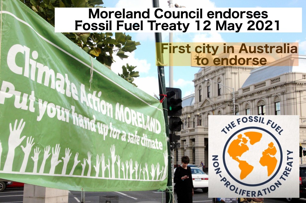 At the Council meeting on Wednesday night (12 May 2021) Moreland Councillors voted to endorse the Fossil Fuel Non-Proliferation Treaty, being the first city, shire or municipal government to do so in Australia.