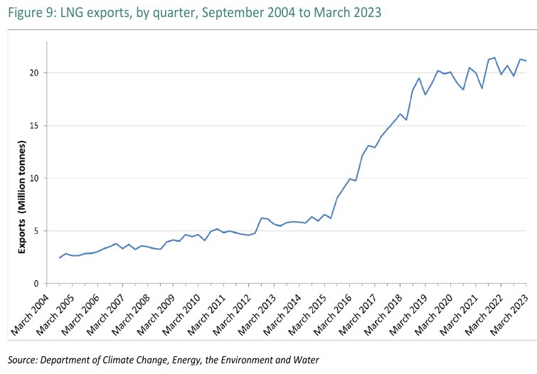 The report highlights that “An important driver of emissions trends in stationary energy over the last 8 years has been the production of LNG for export. Figure 9 shows that LNG exports have increased by 231% compared to the year to June 2015, before the start of the rapid ramp-up.”