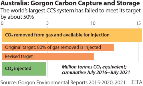 Reported in April 2022 (IEEFA): “At a cost of more than A$3 billion, Gorgon, the largest carbon capture and storage (CCS) project in the world has failed to deliver, underperforming its targets for the first five years of operation by about 50% finds a new report from the Institute for Energy Economics and Financial Analysis (IEEFA)”.