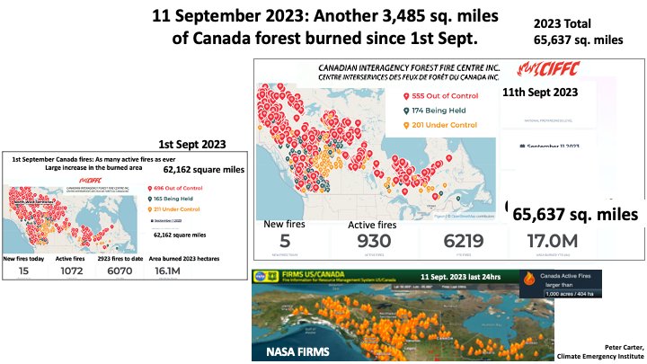 The Canada fires global climate change catastrophe. From 1 Sept. to 11 Sept another 3,485 sq. miles of Canada forest burned, bringing the total to 65,637 Sq. miles. Massive fossil fueled destruction.”