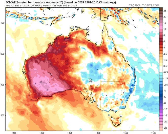 Cameron H: “After a brief cold snap with 4 stations (POR 24-27yrs) setting Sep min records in Southern Aus last week, a strong and lengthy heatwave begins in SW WA (again): Mins: Kalgoorlie 22.8c, beats 1944 record by 0.8c POR 82yrs! Meekatharra 23.2c, smashes 1981 record by 1.7c POR 72yrs!”