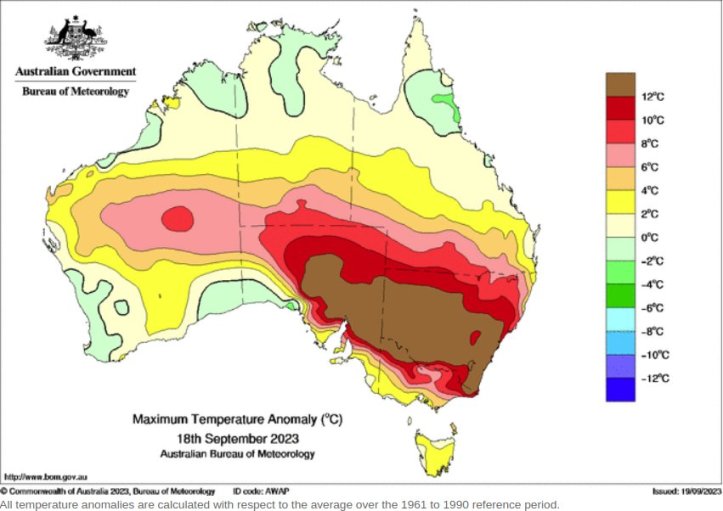 The BOM temperature anomalies for Australia for Monday 18 September shows much of NSW and portions of South Australia and northern and far east Victoria with temperature maximums exceeding 12C for this time of year.: