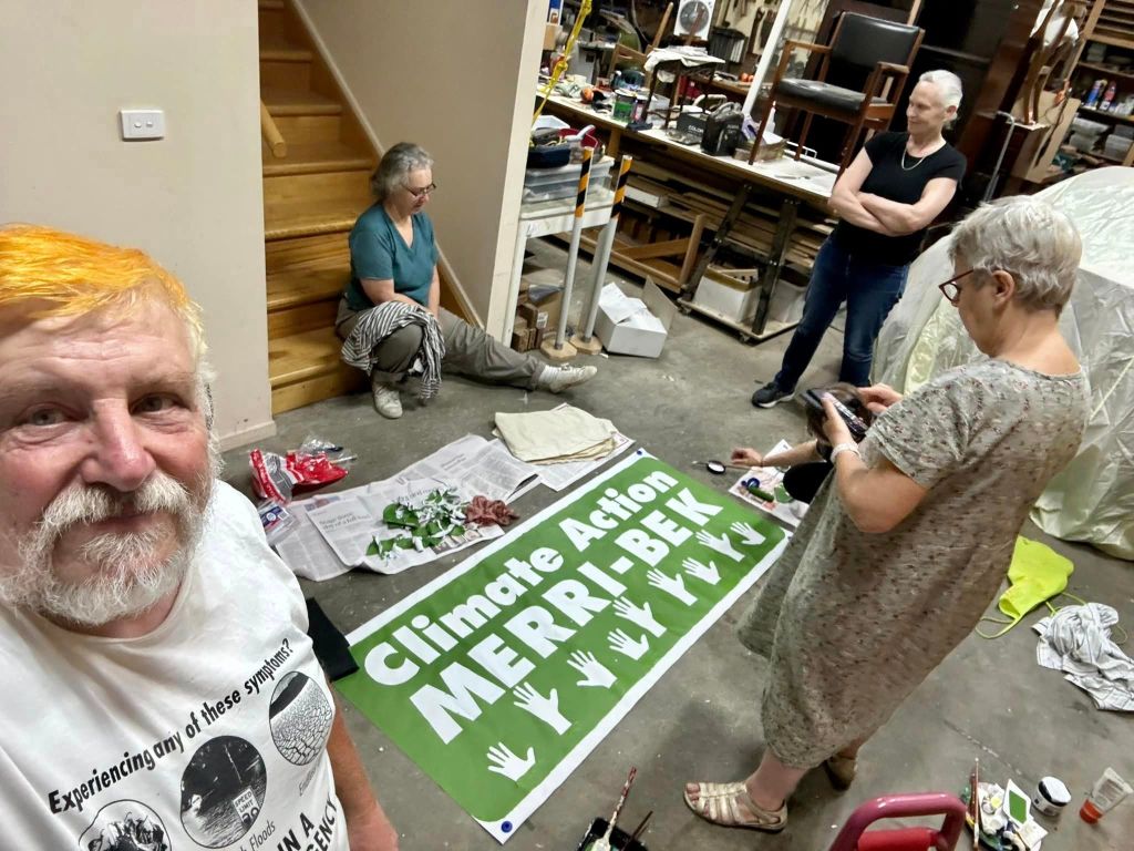 The Friday before the festival several members of Climate Action Merribek met to design and paint a new banner and produce signs and other material. The new banner is an old blind which we have given a second life to helping in climate communications.
