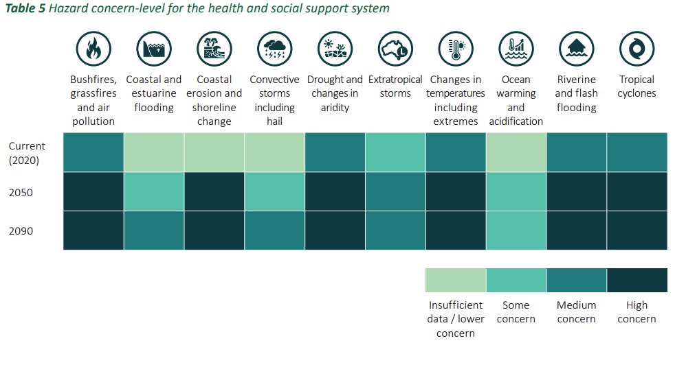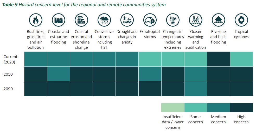 - Human health, medical and emergency services: Risks to human health, and medical and emergency services that damage and disrupt critical health facilities and energy, water and transport infrastructure, especially in regional and remote communities.