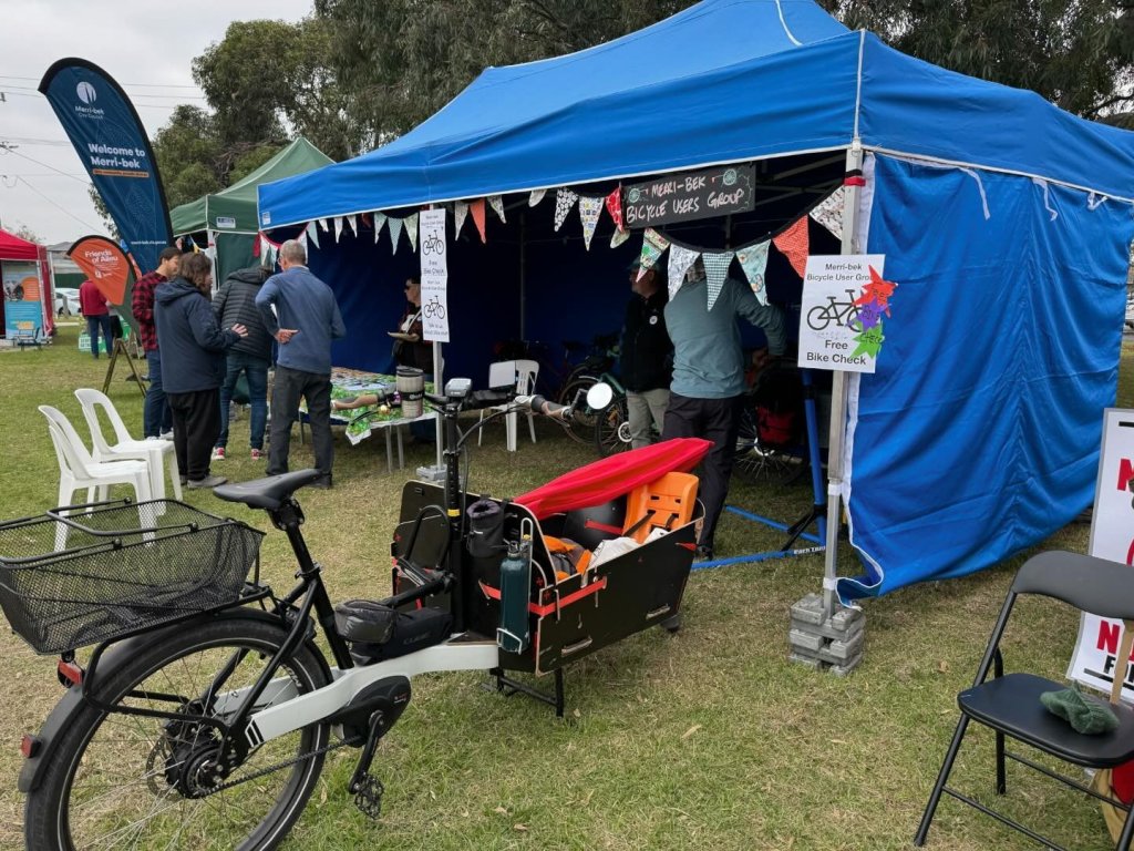 The new banners that we had workshoped (Facebook photos) to paint really made our stall stand out and be prominent. We were located next to Merri-bek Bicycle User Group Stall.