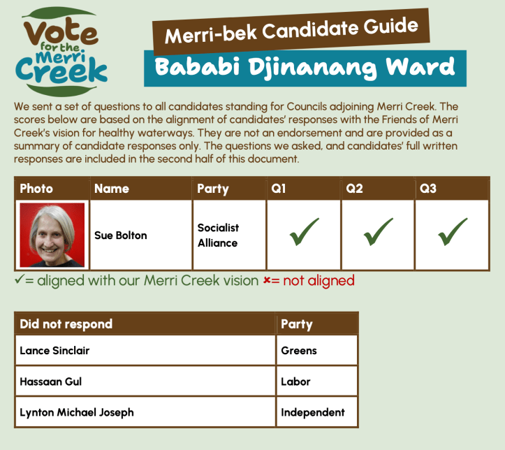 Friends of Merri Creek have surveyed candidates in all wards. The Merri Creek corridor is iconic and questions of sustainability, pollution and biodiversity should be a municipal wide concern to all candidates. The survey is focussed on Merri Creek, Edgars Creek and Coburg Lake, and neglects Merlynston Creek and Campbellfield Creek tributaries. It also ignores the importance of Moonee Ponds Creek and tributaries such as Westbreen Creek on the western side of the municipality, which may provide a reason why candidates from western wards like Djirri-Djirri and Pascoe Vale South did not respond to the survey.