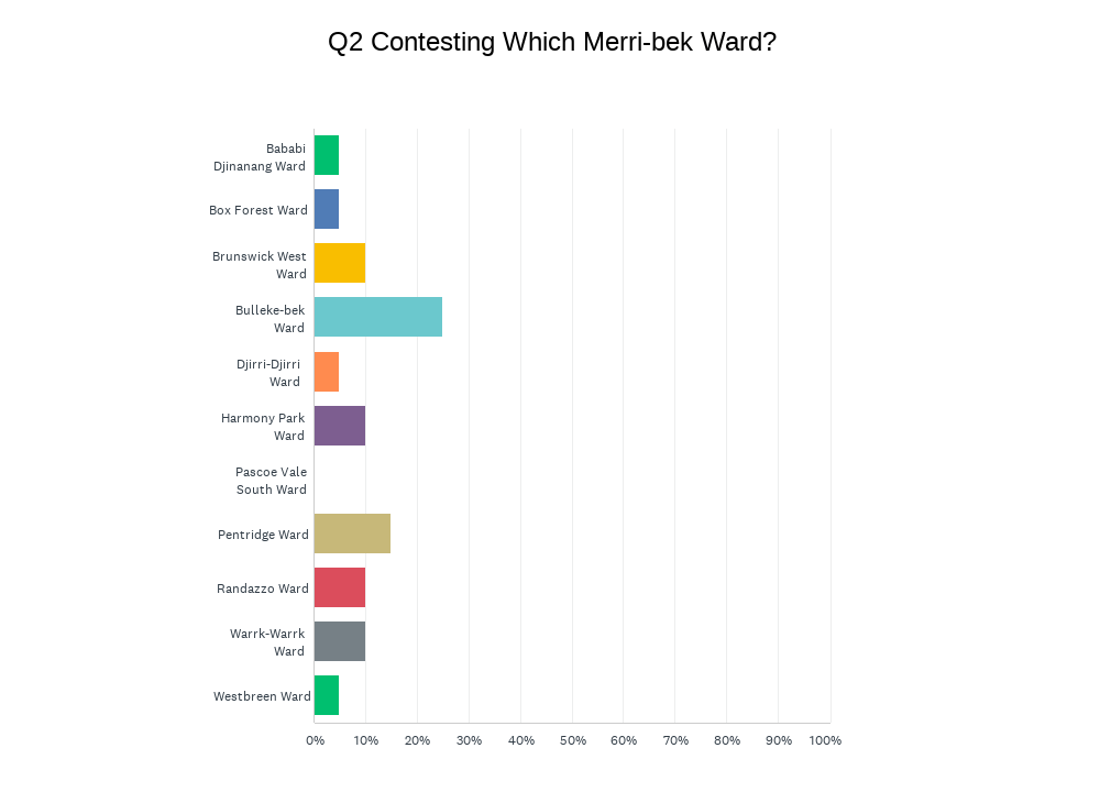 Friends of Merri Creek have surveyed candidates in all wards. The Merri Creek corridor is iconic and questions of sustainability, pollution and biodiversity should be a municipal wide concern to all candidates. The survey is focussed on Merri Creek, Edgars Creek and Coburg Lake, and neglects Merlynston Creek and Campbellfield Creek tributaries. It also ignores the importance of Moonee Ponds Creek and tributaries such as Westbreen Creek on the western side of the municipality, which may provide a reason why candidates from western wards were less likely to do the survey.
