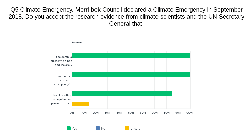 Climate Action Merribek and Neighbours United for Climate Action surveyed candidates in all 11 wards on climate and sustainability issues, which included a climate emergency question, in keeping with the existing declaration by Council in 2018.
