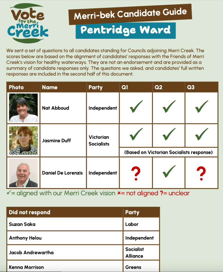 See Friends of Merri Creek 2024 election guide for six Councils in the Merri Creek Catchment.