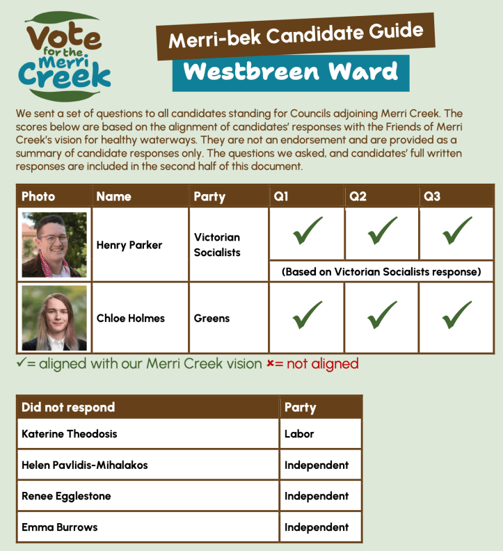 See Friends of Merri Creek 2024 election guide for six Councils in the Merri Creek Catchment.