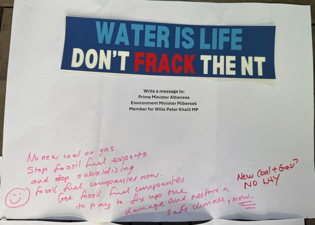 We are delivering these messages to Peter Khalil’s office on Sydney Road to share with Tanya Plibersek, Anthony Albanese and colleagues in the Labor Caucus, and urge them not to proceed with the $1.9 billion infrastructure funding subsidy that includes $1.5 billion for the Middle Arm industrial Hub that will enable fracked gas to be exported as LNG from the Beetaloo Basin.