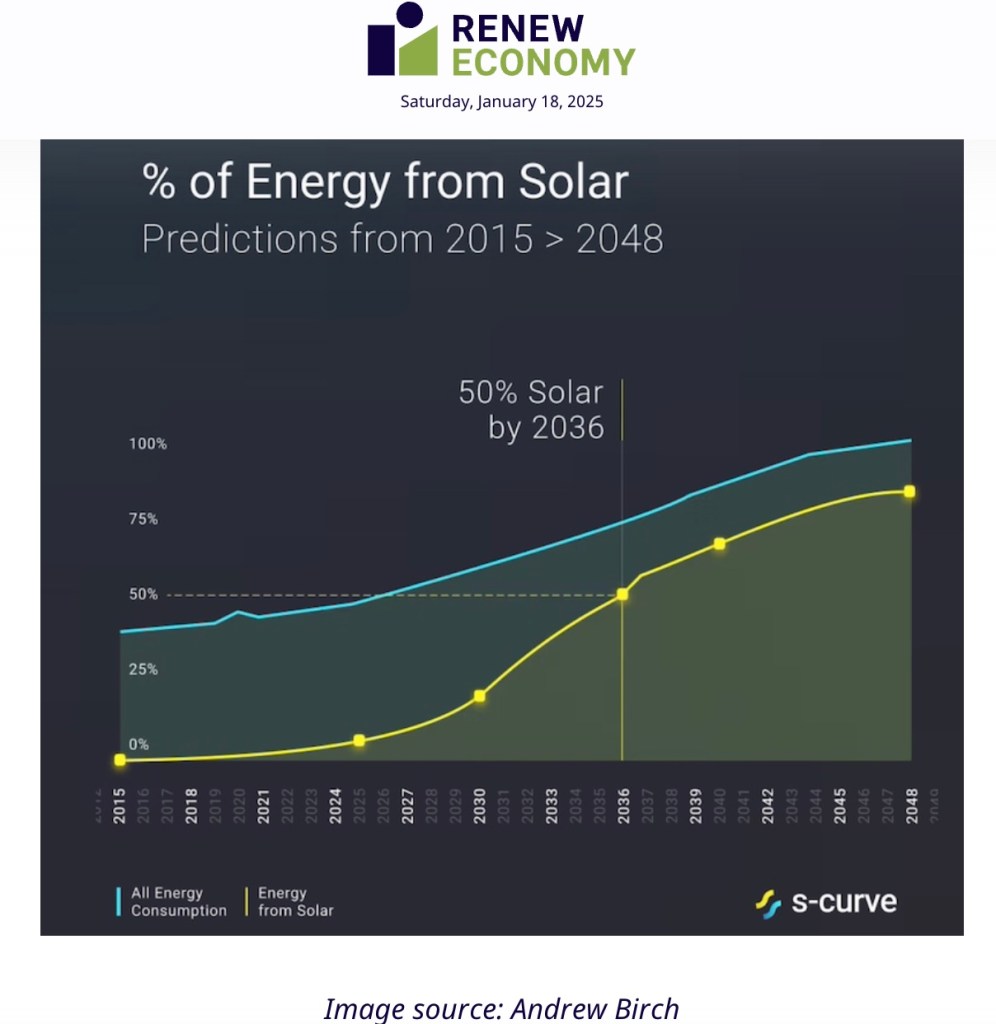 15 January 2025 – It’s the S-Curve, stupid: New model predicts half of world’s energy will come from solar by 2035. (Renew Economy) Electrification will also produce energy savings.