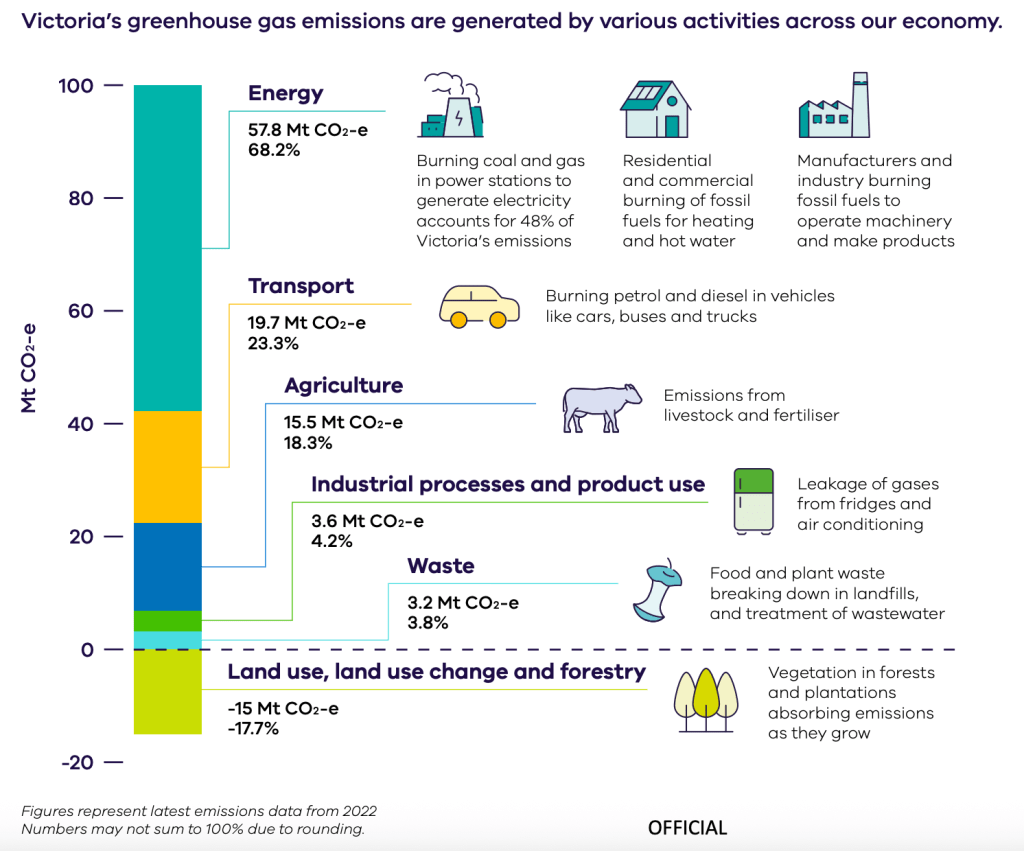 A couple of images from the Summary discussion paper for Victoria’s climate Targets and a breakdown of emissions by sector: