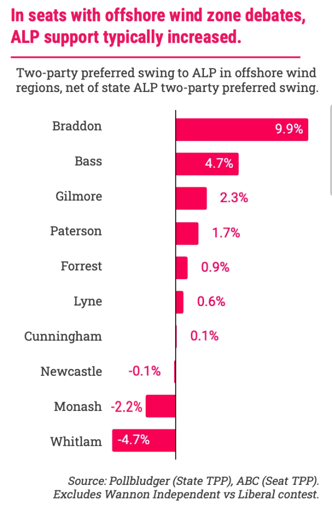 – The ALP’s two-party preferred support increased in most seats with offshore wind debates, despite significant campaigns against the projects, often funded by fossil fuel backed astro-turf groups.