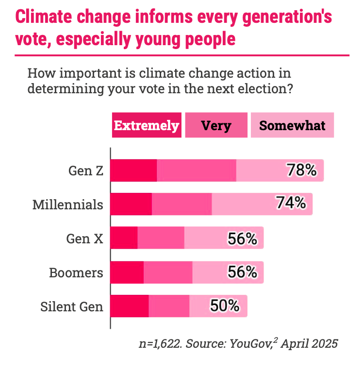 – Three-quarters of Millennials and Generation Z voters named climate change as a top tier voting issue for the 2025 election. This climate voting bloc is now the largest – and still growing – group of Australian voters.