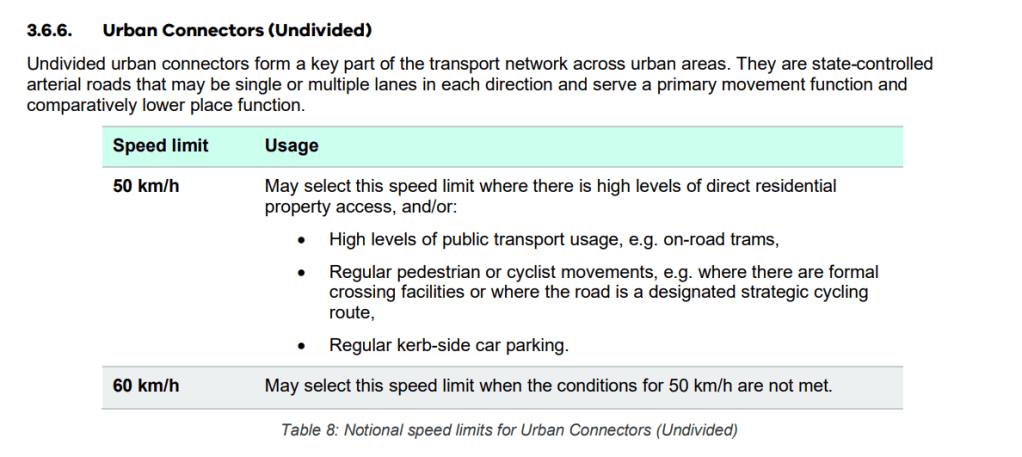 In August 2025, the Victorian government released its new speed zoning guidelines. These new guidelines allow for the speed limits to be reduced from 60 km/h to 50 km/h on most of the arterials roads discussed above. This is what the guidelines specify for Urban Connectors.