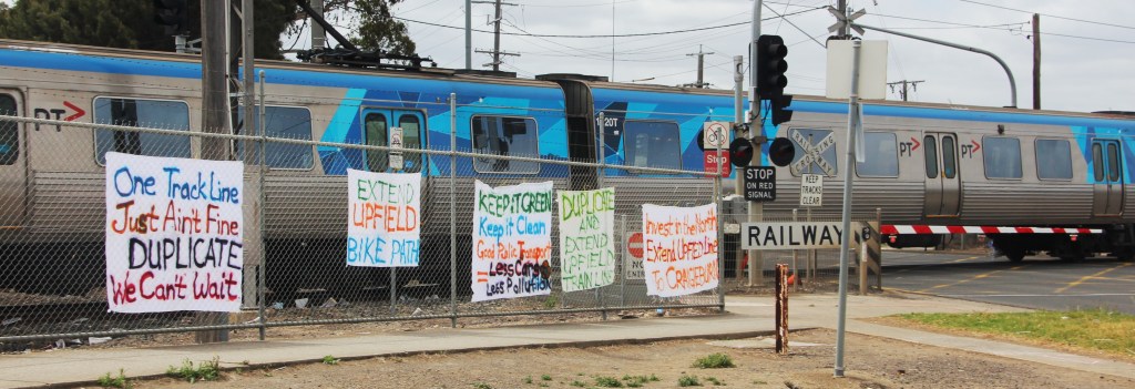 But the frequency of services on the Upfield line is limited by the single track north of Gowrie. Only one train travel can along the 4 km track to Upfield and then return. This can also lead to delays. To make up time, the operator sometimes turns the train around at Batman, forcing train travellers to wait for the next train. Duplication is one of the main advocacy priorities of Merri-bek Council.