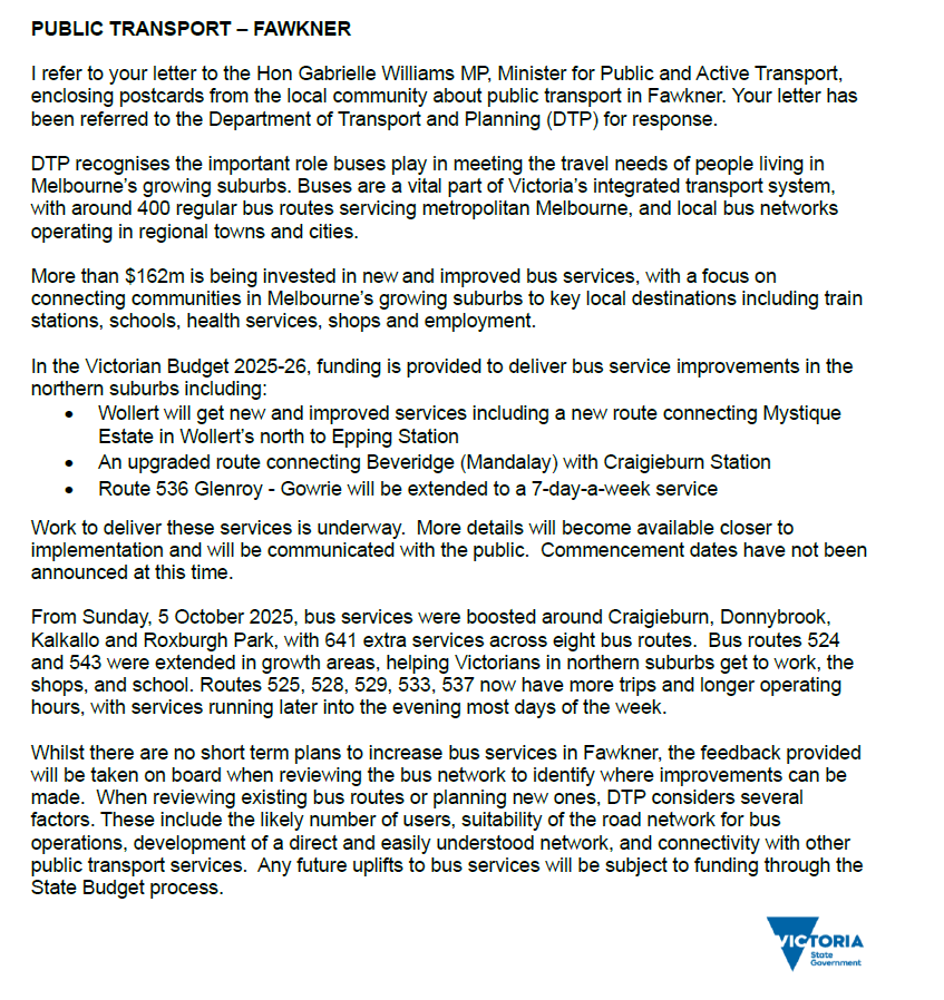 Climate Action Merri-bek campaigns for better public transport. We’ve written a few blogposts about Fawkner – see below. Recently we asked Fawkner residents to write postcards to the Minister about why they wanted better public transport. We sent them to the Minister and have just got a response.