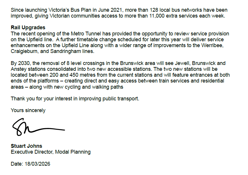 The Minister’s response was very disappointing. It was mostly information about public transport upgrades elsewhere. The only mentions relevant to Fawkner were those from last year’s budget – the 536 bus Sunday service, and an increase in frequency of off-peak services to every 20 minutes on the Upfield Line. (Neither of these have been delivered yet.)